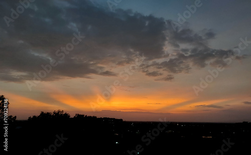 © Pratima, Fototapeta premium Beautiful sunset scenery view of sun hiding behind clouds, golden hour wallpaper, nature photography, natural scenic background, silhouette of trees
