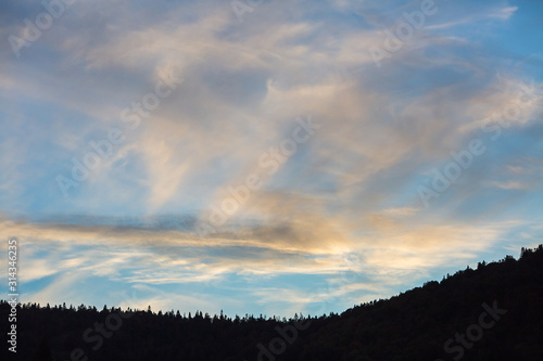 Fototapeta premium beautiful sunset sky over forest and mountains.