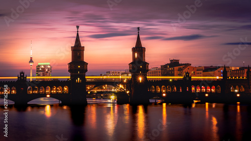 Naklejka premium Beautiful sunset view at the Oberbaum Bridge in Berlin with the famous Television Tower in the back