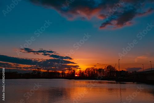 Fototapeta premium Beautiful sunset view with reflections near Plattling, Isar, Bavaria, Germany