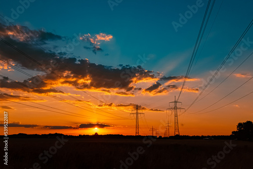 Naklejka premium Beautiful sunset with a dramatic sky and overland high voltage lines near Tabertshausen, Bavaria, Germany