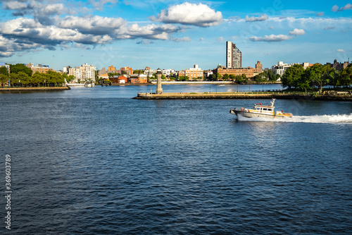 Fototapeta premium Beautiful sunset with clouds and boat speeding and lighthouse