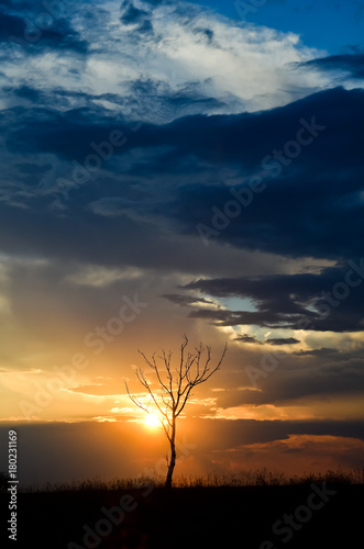 © emiphoto111, Obraz premium beautiful sunset with dramatic sky and one bare tree