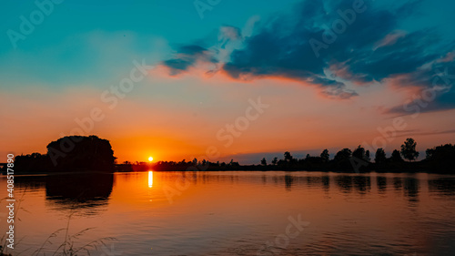© Martin Erdniss, Obraz premium Beautiful sunset with reflections near Mettenufer, Danube, Bavaria, Germany