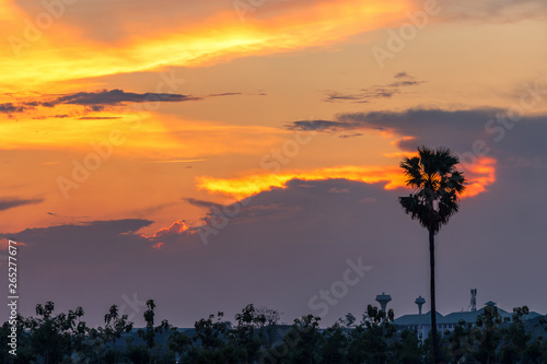© Thinapob, Fototapeta premium Beautiful sunset with silhouette palm trees on the twilight sky background in Thailand.