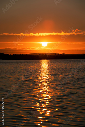 Naklejka premium beautiful sunset with sun and orange sky on the lake