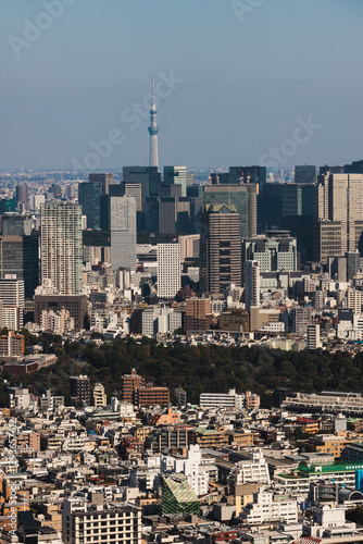 © tsuguliev, Fototapeta premium Beautiful super wide aerial view of Tokyo, Japan, rooftops and skyscrapers, with skyline and city scenery, seen from the observation deck in a sunny day with a blue sky, Tokyo Metropolitan urban area