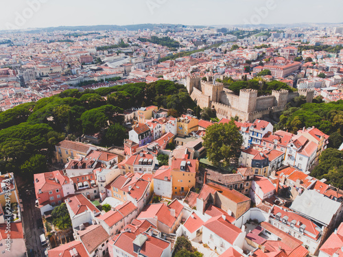 Obraz premium Beautiful super wide-angle aerial view of Lisbon, Portugal with harbor and...