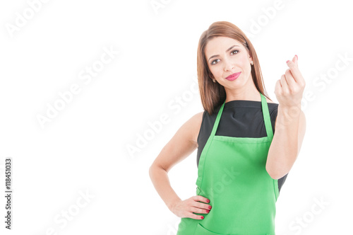 Fototapeta premium Beautiful supermarket saleswoman doing money gesture