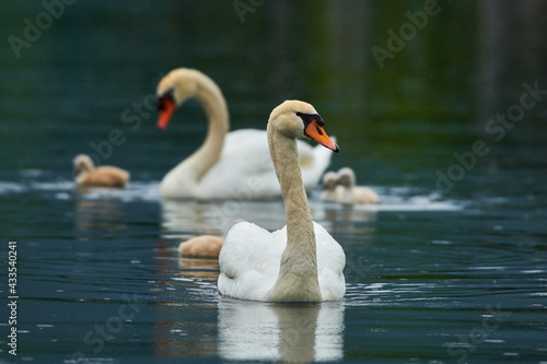 © DannyIacob, Fototapeta premium Beautiful swan family with small Chicks on a lake
