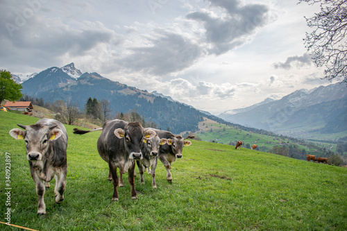 Obraz premium Beautiful swiss cows. Alpine meadows. Mountains.