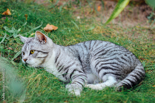 Naklejka premium Beautiful tabby cat on the grass