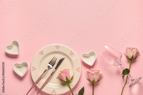 Obraz premium Beautiful table setting for Valentine's Day with rose flowers on pink background