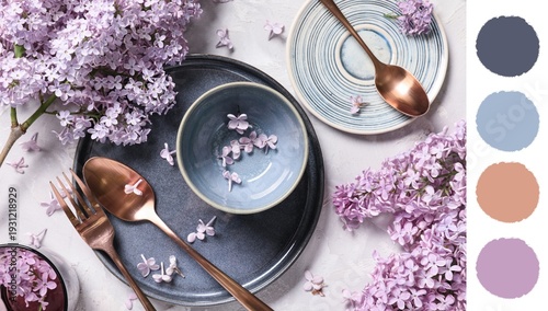 © Pixel-Shot, Fototapeta premium Beautiful table setting with lilac flowers on light background. Different color patterns