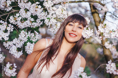 Fototapeta premium beautiful tender woman in light dress in cherry blossom trees