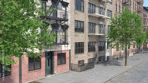 © Arran, Fototapeta premium Beautiful terraced houses and apartments in sunshine on a city road.