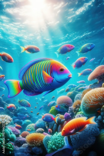 Fototapeta premium Beautiful Thalassoma lunare, commonly known as the Moon Wrasse rainbow fish underwater in the tropical waters of the ocean. They are characterized by their bright and vibrant coloration