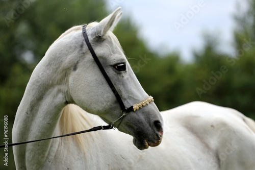 © acceptfoto, Obraz premium Beautiful thoroughbred horse head at farm against natural backgr