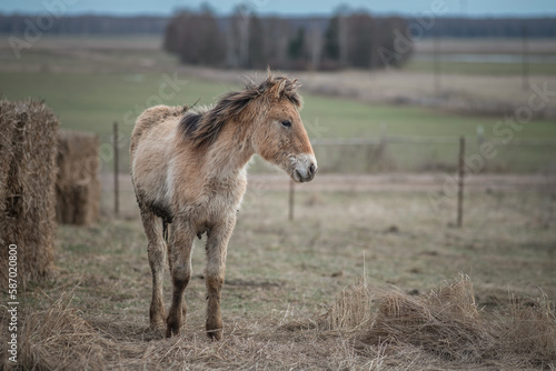 © shymar27, Fototapeta premium Beautiful thoroughbred horse on a farm in a cloudy spring day.