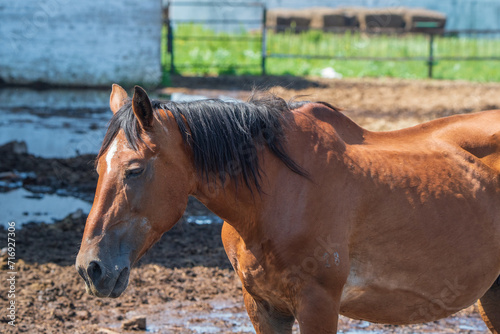 © shymar27, Fototapeta premium Beautiful thoroughbred horses on a ranch field.