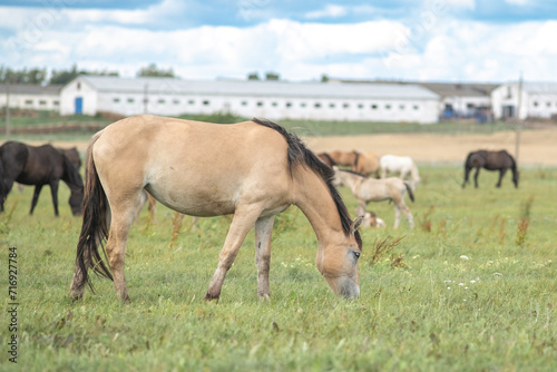 © shymar27, Fototapeta premium Beautiful thoroughbred horses on a ranch field.