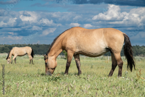 © shymar27, Fototapeta premium Beautiful thoroughbred horses on a ranch field.