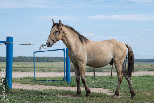 Obraz premium Beautiful thoroughbred horses stand on a farm in summer.