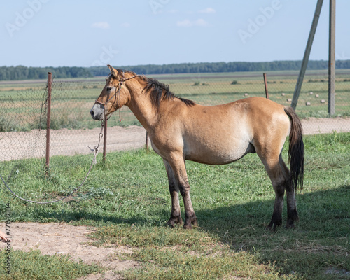 Obraz premium Beautiful thoroughbred horses stand on a farm in summer.
