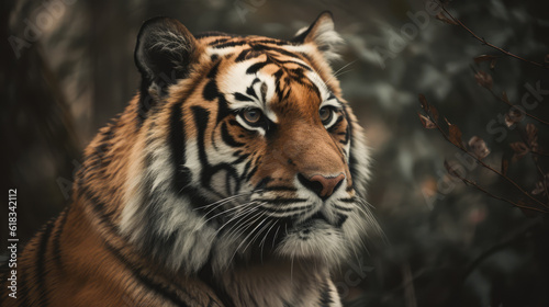 Fototapeta premium beautiful tiger in its natural habitat. Close up of tiger in African plain. Post-processed generative AI