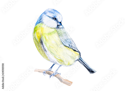 Obraz premium Beautiful tit sitting on a branch. Watercolor illustration isolated on white.