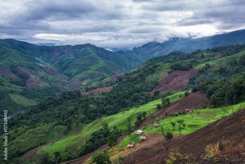 © ordinary042, Fototapeta premium Beautiful top view of mountain forest landscape with misty morni