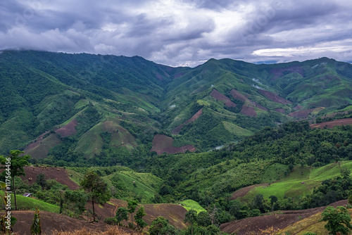 © ordinary042, Fototapeta premium Beautiful top view of mountain forest landscape with misty morni