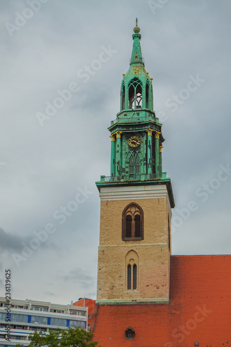 © Nataly, Obraz premium Beautiful tower with a spire and gold ornaments. Red brick roof religious buildings. Old architecture, clock tower. Cityscape.