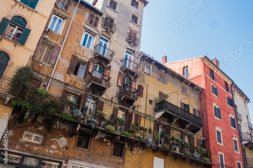 © yassine, Fototapeta premium Beautiful traditional Italian building with flowers on balcony of medieval wall, Piazza delle Erbe, Verona, Italy