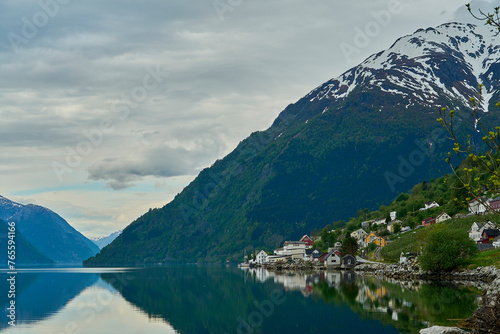 © Jens, Naklejka premium beautiful tranquil landscape at the beach of Hardanger fjord with calm green water and snow covered mountains of the highlands in Norway in the background.
