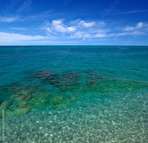 © Alekss, Fototapeta premium Beautiful transparent sea with blue sky