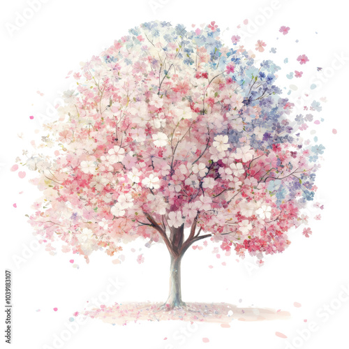 © MP-AI, Fototapeta premium beautiful tree adorned with vibrant blossoms in shades of pink and blue, creating serene and enchanting atmosphere. delicate petals gently fall, enhancing tranquil scene