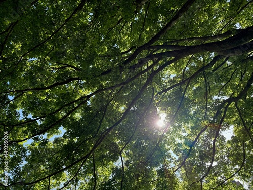 © New Africa, Fototapeta premium Beautiful tree crown with green leaves as background, closeup