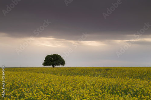 © alexionutcoman, Obraz premium Beautiful tree in a rape field at sunset