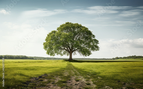 © MUS_GRAPHIC, Obraz premium Beautiful tree in the middle of a field covered with grass with the tree line in the background