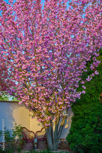 Naklejka premium beautiful tree (prunus serrulata kanzan) blooming in the garden, spring.