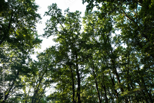 Fototapeta premium Beautiful trees with green leaves in forest, bottom view