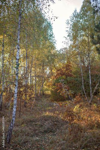 Obraz premium Beautiful trees with yellow golden foliage in autumn forest, golden...
