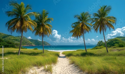 Fototapeta premium Beautiful tropical beach with palm trees and a blue sky background,...