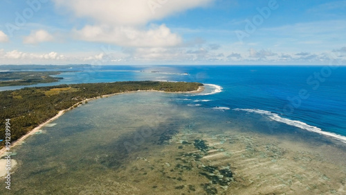 Obraz premium Beautiful tropical island with sand beach, palm trees. Aerial view of tropical beach on the island Siargao, Philippines. Tropical landscape: beach with palm trees. Seascape: Ocean, sky, sea