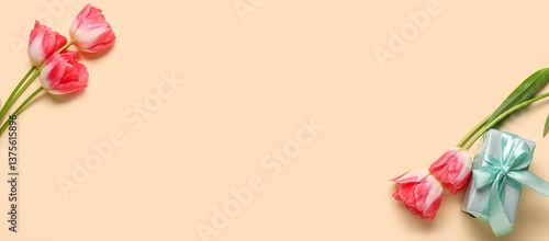 Fototapeta premium Beautiful tulips and gift on beige background with space for text, top view