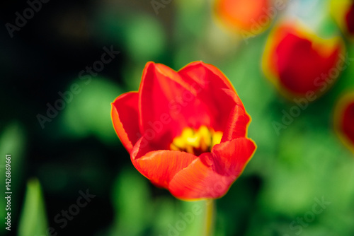 © Cherkasova Alie, Obraz premium Beautiful tulips in a flower bed in the garden. The blossoming buds of spring flowers. Beauty is in nature.