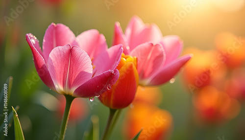 Fototapeta premium Beautiful tulips in pink and orange with sparkling dew under warm sunlight in...