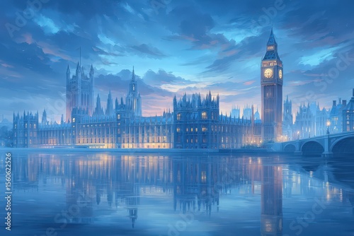 Naklejka premium Beautiful twilight captures the Houses of Parliament and Big Ben reflected in calm waters. The soft glow of lights enhances the serene atmosphere of this iconic London landmark.