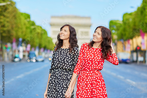 © Ekaterina Pokrovsky, Naklejka premium Beautiful twin sisters in front of Arc de Triomphe